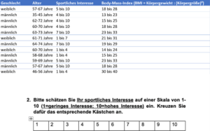 Die ermittelten Daten werden mit Patienten verglichen, die eine chronische Erkrankungen haben. Das Matching der Kontrollgruppen erfolgt nach Alter, Geschlecht, BMI und sportlichem Interesse.